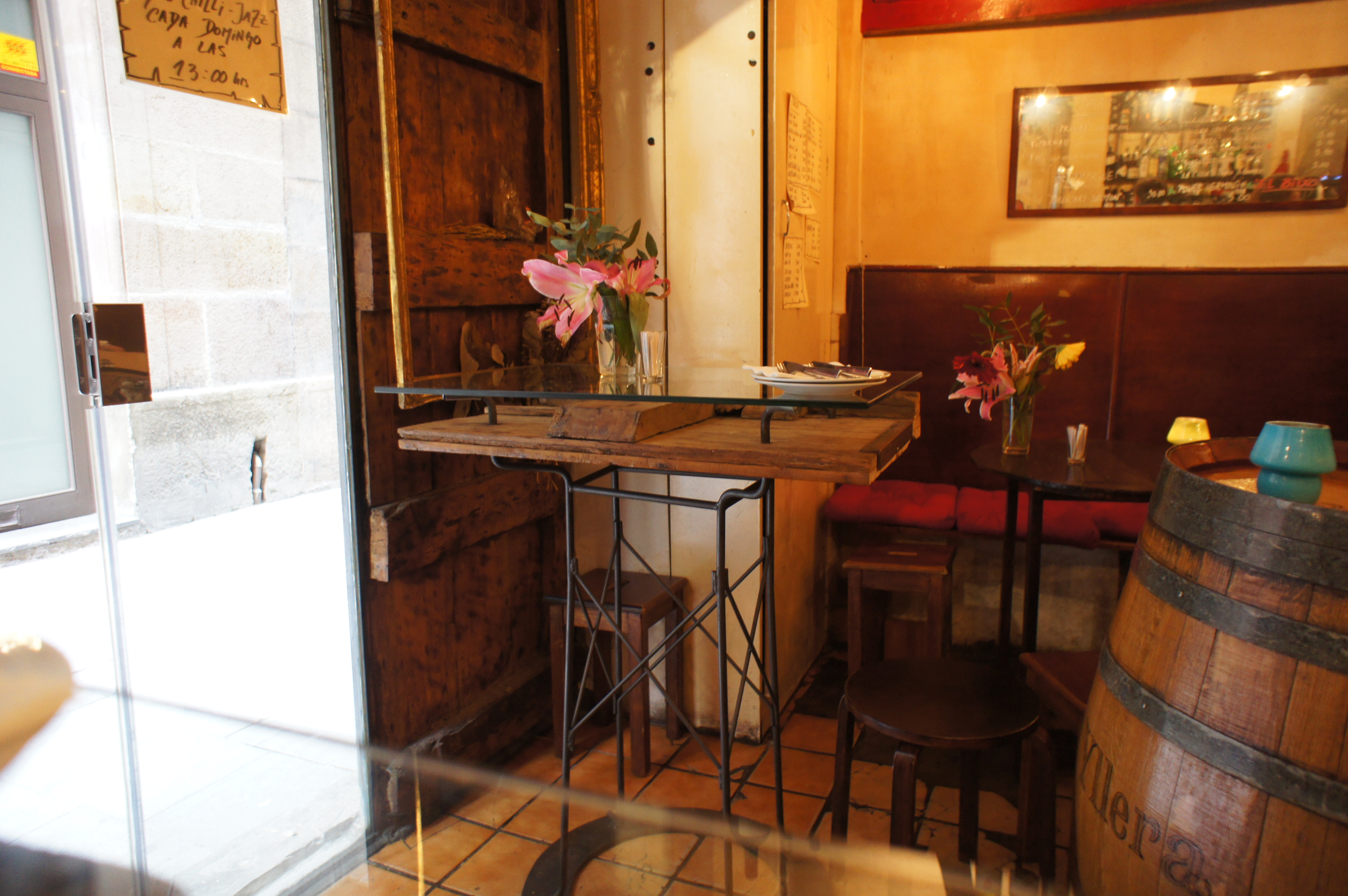 Cuando se transformó la entrada de la bodega `El Bitxo´ por cumplir con la normativa municipal, guardamos partes de la puerta substituida. Ahora vuelven al local como componente del mobiliario.