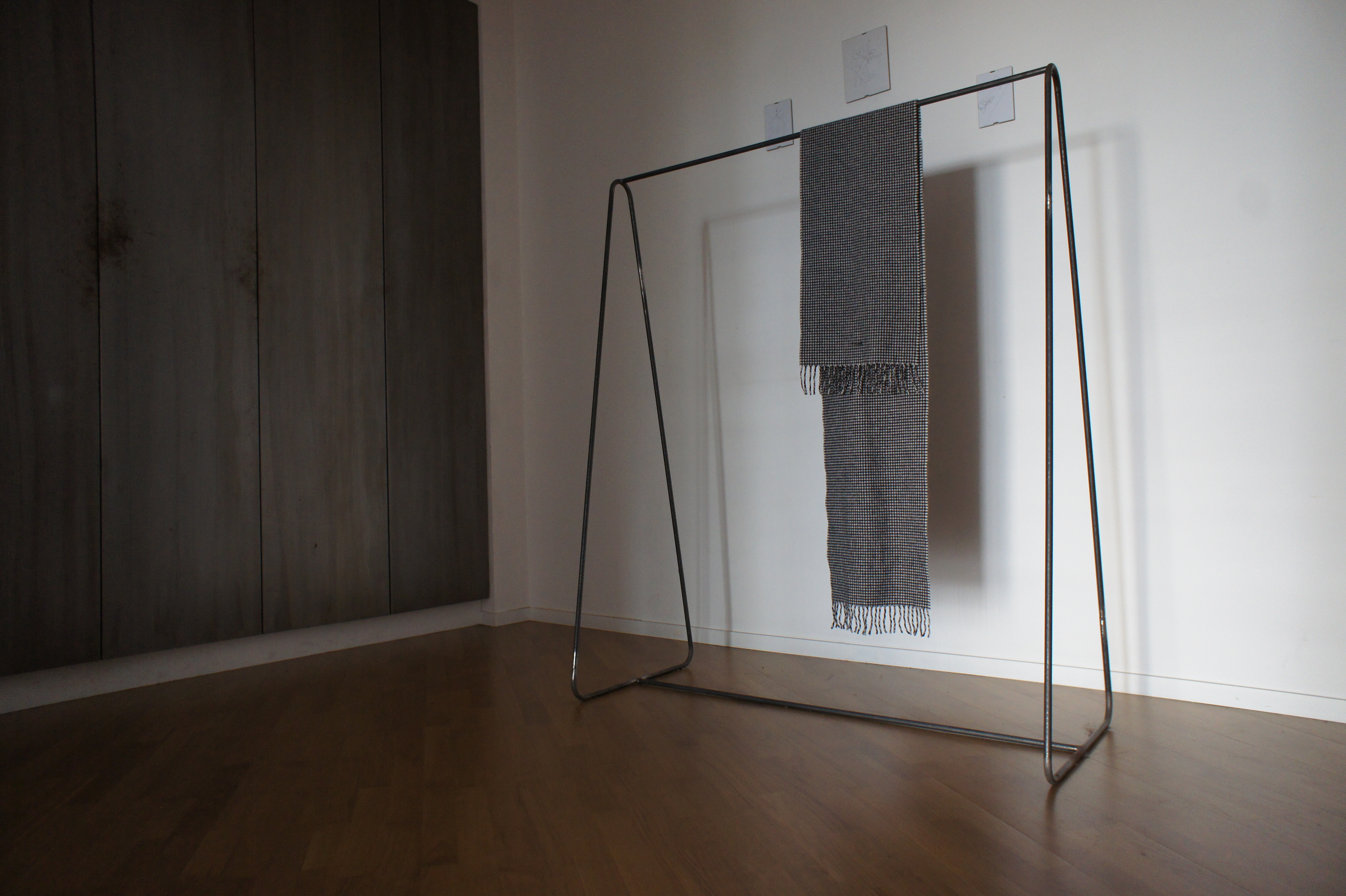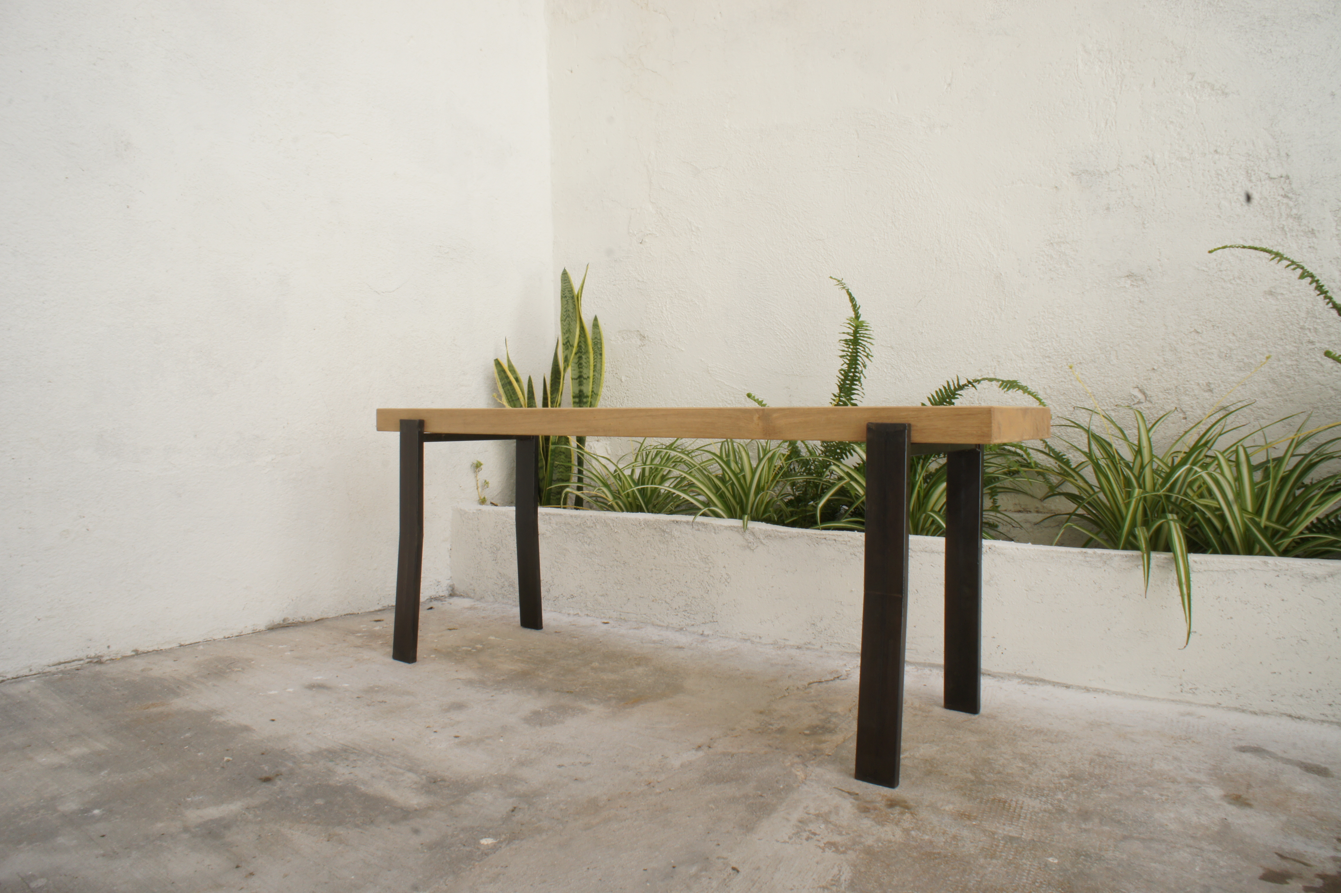 El carácter originario de materiales primarios como la madera y el acero ya constituye un contraste lo suficiente interesante, eximiéndonos de la necesidad de añadirle otro elemento llamativo. La singularidad del sencillo soporte consiste solo en una ligera alteración de la línea recta.