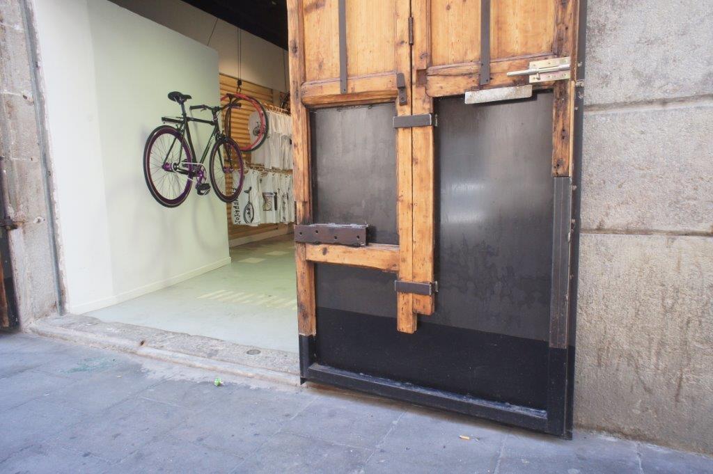 Debido a la orgía de agua a que se somete diariamente el centro de la ciudad por parte del ayuntamiento, la mayoría de las puertas de los locales están deterioradas. En nuestro caso la mitad inferior simplemente no existía a penas. Complementamos la parte sana del bastidor con una estructura tubular y revestimos con plancha de corten. La solución rinde homenaje a la estructura original, quedando un conjunto coherente.